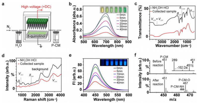 利用图3a所示的装置,在常压条件下放大N2与(H2O)2+•的歧化反应,可收集到产物NH2OH和HNO。在收集时将HNO和NH2OH+•产物在空间上分离:带正电的NH2OH+•产物在电场的驱动下进入阴极的收集板上,而中性的HNO产物随N2气流进入反应器出口的收集瓶中。图3b中,将N2与(H2O)2+•反应的产物NH2OH实时与8-羟基喹啉探针反应形成吲哚酚,并记录不同波长下吲哚酚随时间变化的吸光度值,可以看到随时间增加,紫外吸光度数值增高。图3c是实验所采集样品(红色)和NH2OH•HCl标准品(黑色)的红外光谱。图3d为所收集样品(红色)和NH2OH•HCl标准品(黑色)的拉曼光谱。图3e为N2与(H2O)2+•在线反应得到了HNO,HNO与P-CM探针在线反应形成的7-羟基香豆素在不同时间的荧光光谱,其信号强度与反应时间也有明显的相关性。图3f是将在线反应得到的HNO通入P-CM溶液前后的质谱对比图,显示P-CM与HNO反应生成P-CM氮杂化物和P-CM氧化物。总体而言,质谱和光谱数据为N2与(H2O)2+•之间的歧化反应中形成NH2OH和HNO提供了明确的证据。