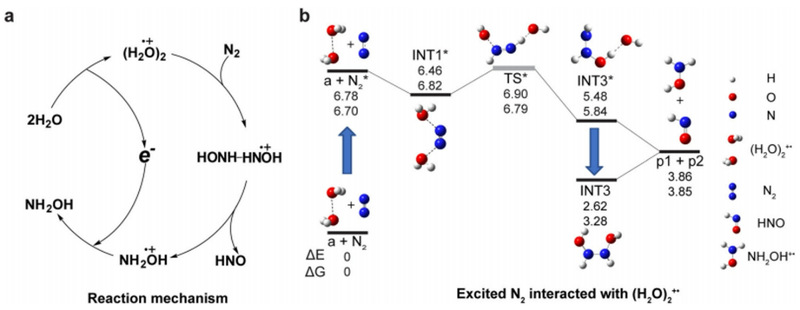 图2a中概述了N2与(H2O)2+•反应可能的机理示意图。图2b用CCSD(T)法计算了N2+ (H2O)2+•→NH2OH+•+ HNO歧化反应中可能参与的分子和离子种类的几何形状和能量(在298 K和1atm压力下)。表明N2与2c-3e[H2O•••OH2]+结构发生有效反应。