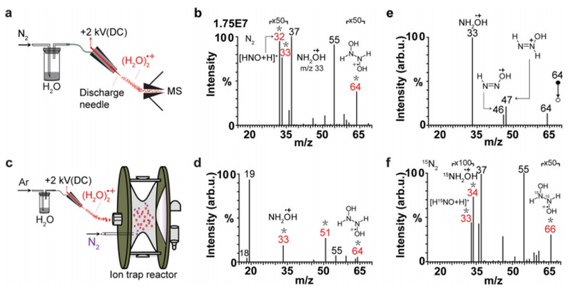 本文先是通过实时质谱检测。图1a中,当N2和水蒸气通过同样的通道直接进入质谱口时,观察到产物离子m/z 32、m/z 33和m/z 64(图1b)。这些信号分别为HNOH+ (m/z 32)、NH2OH+(m/z 33)和HONH-HNOH+ (m/z 64)。初步推测这些离子是由(H2O)2+•与N2的反应得到的。为了验证这一假设,图1c中,在中性N2气体存在的情况下,水等离子体中形成的(H2O)2+•(m/z 36) 在离子阱中被选择性捕获,中性N2直接引入离子阱。当捕获的(H2O)2+•被射频场激活时,观察到产物信号在m/z 18(从(H2O)2+•中去除H2O)、m/z 19(从(H2O)2+•中去除•OH)、m/z 33 (NH2OH+•)、m/z 51 (NH2OH+•+ H2O)、m/z 55 ((H2O)3H+)和m/z 64 (HONH-HNOH+•)处出现(图1d)。这些观察结果证实了(H2O)2+•与N2之间存在反应。图1e中,碰撞诱导解离数据支持了m/z 64信号对HONH-HNOH+•的化学解离,显示m/z 33处的特征片段对应于HNO的消除,m/z 46和m/z 47也在图1b中可见。这些结果进一步得到了同位素取代基实验的支持(图1f)。同样,当N2被15N2取代时,检测到m/z 33和m/z 34处的信号(图1f),分别表示H15NOH+和15NH2OH+•的形成。在15N2实验中为HO15NH-H15NOH+• (m/z 66)(图1f)。
