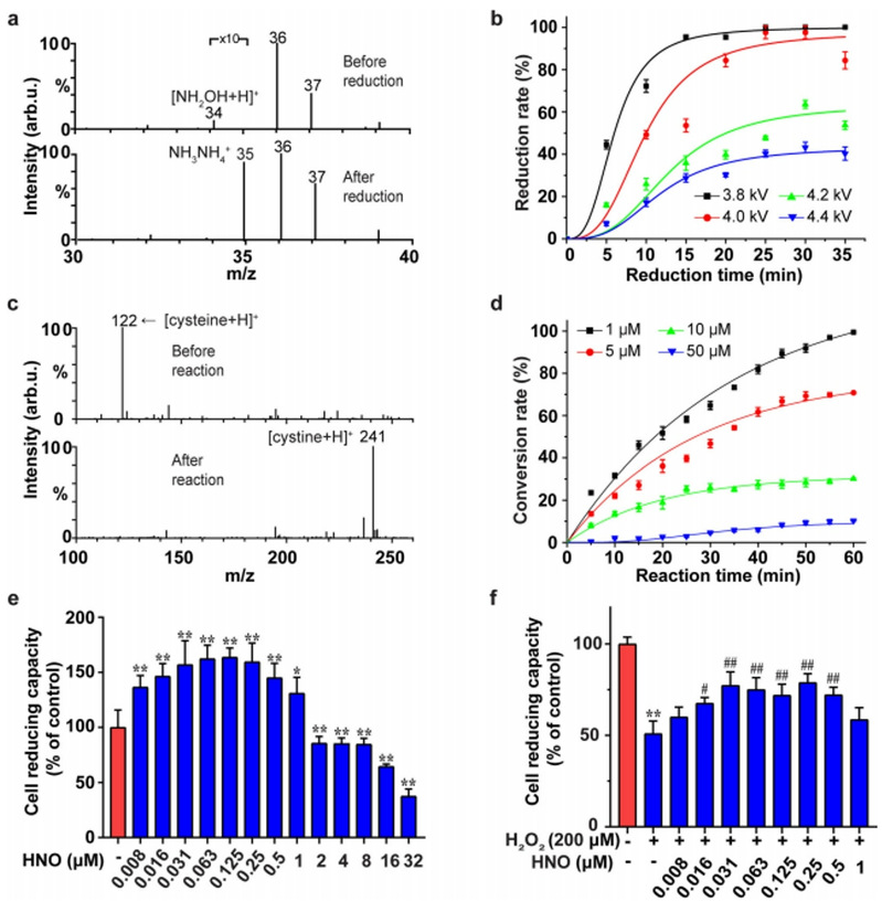 此外,作者将生成的两个产物NH2OH和HNO进行了应用。图4a中,质谱数据表明,收集到的NH2OH产物(m/z 34)可以电解还原成为NH3(m/z 35)。m/z 36和m/z 37处的信号对应于(H2O)2+•和H+ (H2O)2。图4b采用靛酚蓝法测定了不同放电电压下收集的NH2OH电解还原为NH3的动力学。图4c的质谱检测证实,产物HNO可以将 (m/z 122)转化为胱氨酸(m/z 241)。图4d为产物HNO(~25 μM)将不同浓度半胱氨酸转化为胱氨酸的动力学曲线。图4e为不同浓度HNO单独作用对HT22细胞还原能力的影响。图4f为HT22细胞用不同浓度的HNO预处理24 h后,加/不加H2O2(200 μM)孵育1 h后的变化,细胞活力测定结果表明,产物HNO可用于保护HT22细胞免受H2O2诱导的损伤,该部分工作由江西中医药大学朱卫丰教授团队完成。