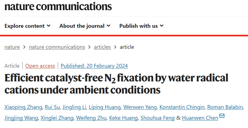 Zhang et al. Efficient catalyst-free N2 fixation by water radical cations under ambient conditions. Nature communications, 2024, 15, 1535.