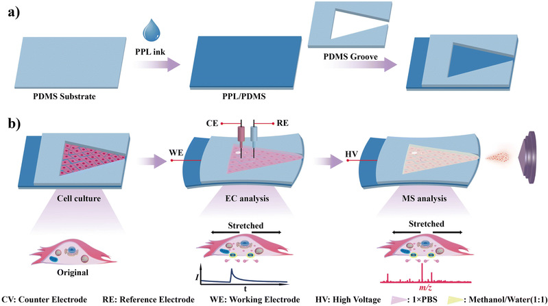 基于柔性可拉伸电化学分析技术与 AIMS 的互补性,东华理工大学徐加泉教授带领研究团队开发了一种可拉伸电极电化学-质谱技术技术用于细胞机械转导的原位分析。将 LiTFSI 掺杂的 PEDOT:PSS 导电油墨旋涂在 PDMS 基底上制得柔性可拉伸电极,该电极可同时用作可拉伸柔性电化学传感器和可拉伸柔性电离源,对细胞机械转导过程进行原位电化学和质谱协同分析。