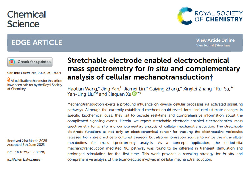 本工作为研究细胞机械转导提供了一种重要的分析方法。该成果以“Stretchable Electrode Enabled Electrochemical Mass Spectrometry for In Situ and Complementary Analysis of Cellular Mechanotransduction”(《可拉伸电极电化学质谱技术用于细胞机械转导分析》)为题,发表在英国皇家化学会期刊 Chemical Science #ChemSci 上。