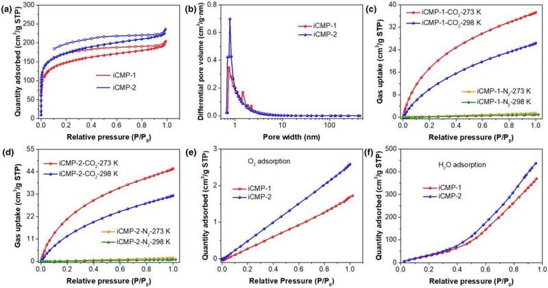 图2 a) 77 K下iCMP-1和iCMP-2的N2气体吸脱等温线;b) iCMP-1和iCMP-2的孔径分布;c) iCMP-1和d) iCMP-2在273/298 K下的CO2和N2吸附等温线;e) iCMP-1和iCMP-2在298 K下的O2和f) H2O吸附等温线。