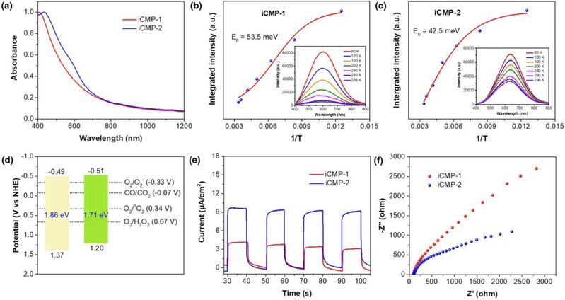 图3 a) iCMP-1和iCMP-2的紫外可见漫反射光谱;b)和 c) iCMP-1和iCMP-2荧光强度随温度的变化(插图为77 ~ 325 K下聚合物的荧光变化);d) iCMP-1和iCMP-2的能带结构图;e) iCMP-1和iCMP-2的瞬时光电流响应;f) iCMP-1和iCMP-2的电化学阻抗图。