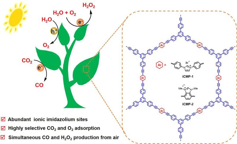 图1 离子共轭微孔聚合物协同光催化还原空气中CO2和O2示意图。