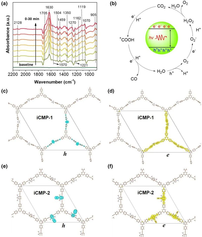 图5 a) CO2光还原过程中iCMP-2的原位红外图;b) iCMP-2光催化气相CO2光还原的可能机理;c-f) iCMP-1和iCMP-2的激发态空穴和电子分布(0.0003 ebohr-3)。