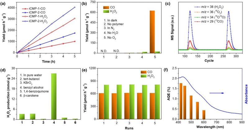3. 在模拟太阳光(100 mW cm-2)下,iCMP-2的CO/H2O2产率为611.8/810.6 μmol h-1 g-1,该效率超过了类似条件下绝大多数的光催化剂。